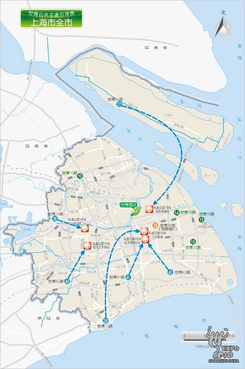 在本市吴淞客运中心、杨浦体育场、虹口足球场、上海火车站、上海体育馆、上海南站等6个旅游集散中心设有旅游巴士直达世博园区。