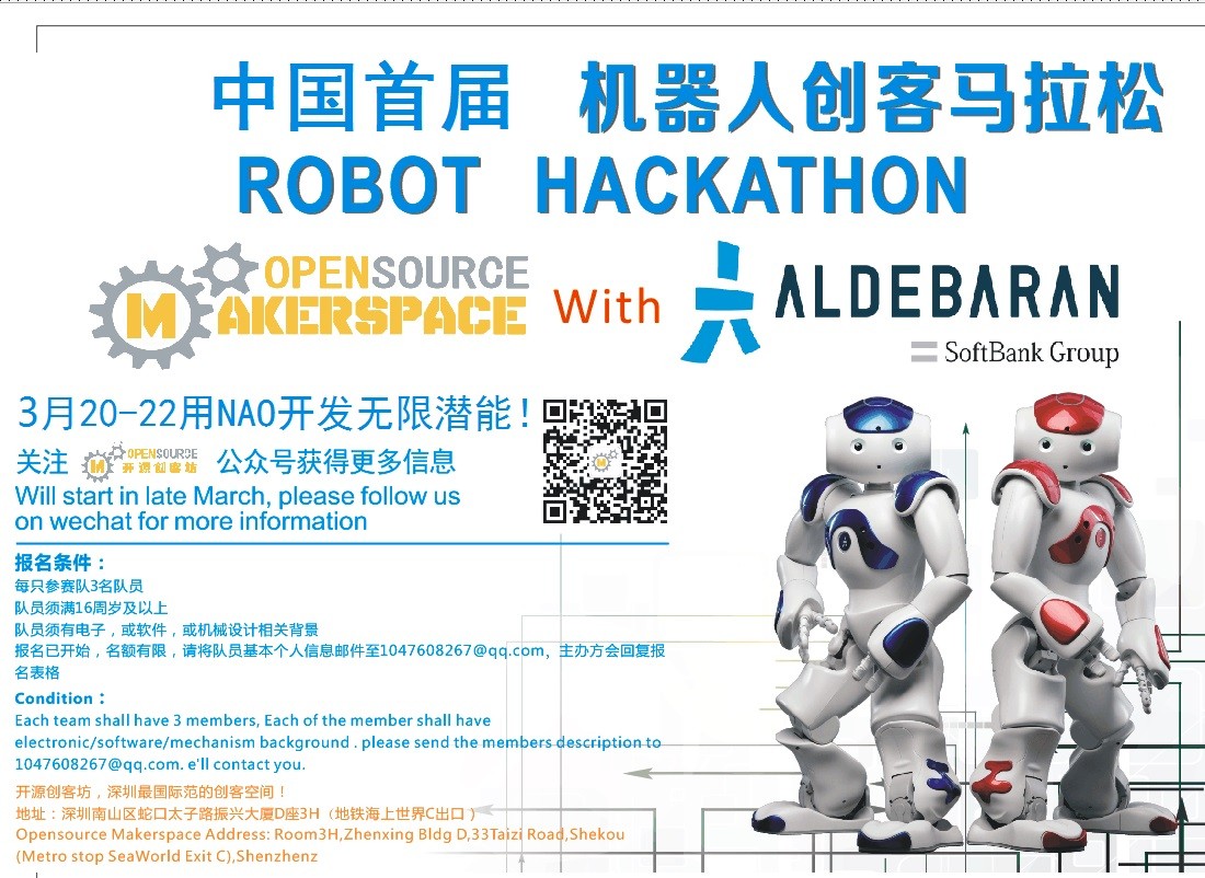 中国首届机器人创客马拉松比赛,由开源创客坊及法国Aldebaran(软银旗下)共同发起。将于3月20日至22日在深圳蛇口开源创客坊举行。