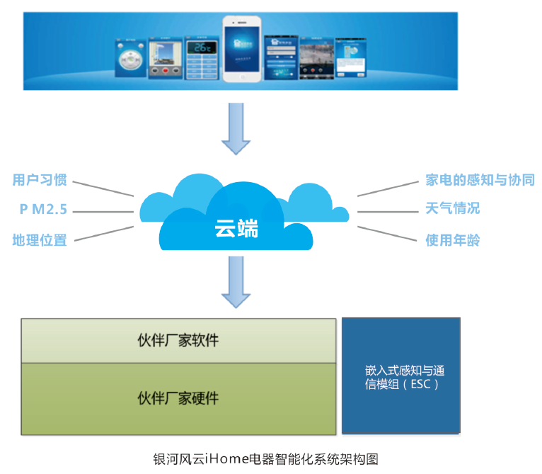 银河风云公司的iHome智能电器解决方案以低成本、产品化、高稳定的“端-云-端”系统架构,让更多的加点企业在智能家电浪潮中赢得更多的市场份额。该整体解决方案融合了多重物联网技术和移动互联网技术,能让家电合作厂商通过“硬件集成、云端接入、APP操作”的方式快速实现传统家电的智能化改造与升级。
