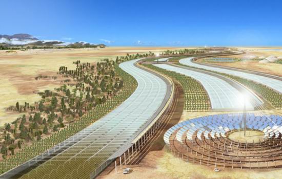 “探索”建筑事务所(ExplorationArchitecture)也非常喜欢海水温室这个设想,但这一想法的“野心”还不足够大,没有让“探索”产生浓厚兴趣。为此,这家建筑事务所提出了一项更引人注目的提议,在世界上最大的沙漠——撒哈拉沙漠建造一个太阳能发电站并与一个海水温室“协同”作战。这种“双管齐下”不仅可以提供清洁能源,同时也可以起到灌溉作用。