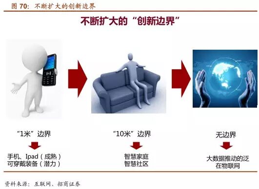 智能家居将成为创新边界的下一波应用。从用户体验来看,用户对“1 米界”的控制欲望已经得到满足,对于“10 米界”范围内的设备控制和交互欲望还处于起步和培养的阶段,在“10 米界”范围内用户和设备的作用距离加大,交互模式改变,出现颠覆“1米界”创新应用的概率更高;芯片、控制器和平台产品体系的日趋完善将加速打破“1米界”的创新限制,加速“10 米界”创新平台的建设。