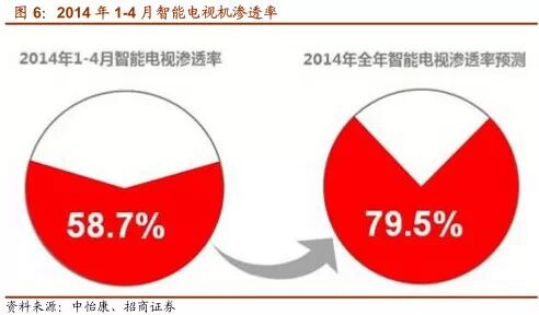 中怡康线下零售监测的数据显示:2014 年 1 月到 4 月智能电视的渗透率已经达到了58.7%,2014 年下半年智能电视的渗透率将持续增长,预计 2014 年全年智能电视的渗透率将达到 79.5%,而 2013 年智能电视的渗透率仅为 48.9%。