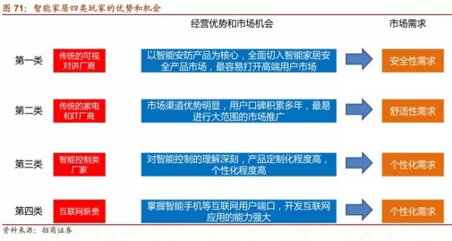 我们认为无论是 NEST 还是 Dropcam,一方面,这些产品有效解决了用户痛点,瞬间占领市场,获取了大量用户。另一方面,这些产品一旦进入用户家庭,具备了一定的排他性,能够取得较强的用户粘性,并且得到用户的大量数据,对于以后其他配套产品的推进具有重要意义。接下来我们将详细探讨智能家居的发展路径和市场前景。