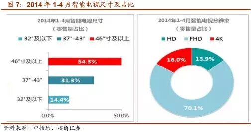 从消费者购买行为来看,消费者在选择智能电视时,倾向于选择大屏的智能电视。中怡康数据显示:2014 年 1 月-4 月智能电视尺寸分布中,有 54.3%的智能电视是 46 寸及以上的智能电视,32 寸及以下的电视占比仅为 14.4%。除了大屏,消费者在购买智能电视时还倾向于选择更清晰的智能电视,2014 年 1-4 月智能电视分辨率中,4K 产品渗透率已经达到了 16.0%。