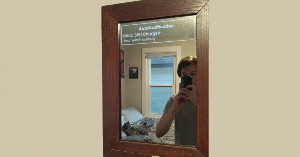 尽管能显示天气、新闻等信息的智能镜子早已经不再是新鲜的创意,但依然有人乐此不疲的尝试实现科幻电影的场景。今日网民Nick Nothom在知名社区Reddit上分享了他所实现的智能镜子,通过连接Android Wear智能手表显示相关的通知。