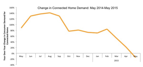根据Argus Insights近期的一份报告,2015年上半年,用户对互联家居产品的兴趣正明显滑坡,而目前仍在继续下降。根据这份报告,今年5月,消费者对互联家居产品的兴趣下降了15%,低于去年同期的水平。
