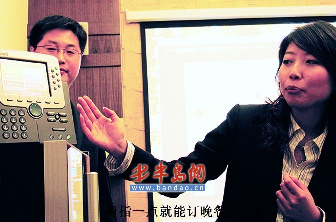 到了该吃晚餐的时间了,工作人员按照IP电话上的选择提示,一步步进入了餐饮预订的菜单,就像浏览网上的各个饭店的菜品,只需要自己用手点点屏幕,就可以选好适合自己的菜品和饼干。工作人员现场演示后,不到两分钟,一份热汤以及一份芝士咸饼干就预订完毕,主人只需要在家里稍作等待,就有美味的晚餐送上门来。