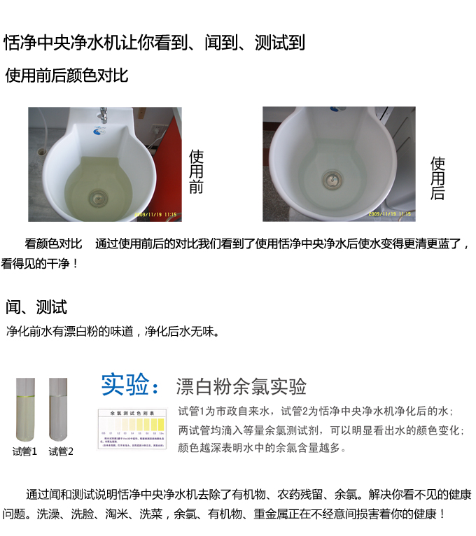 中央净水机全自动垡头有效去除水中的异色、异味;进一步滤除水中微小杂质、胶状体;去除水中的漂白粉余氯、农药、重金属;保留对人体有益的矿物质。使水变得碧清、碧蓝,去除对人体有害的物质。