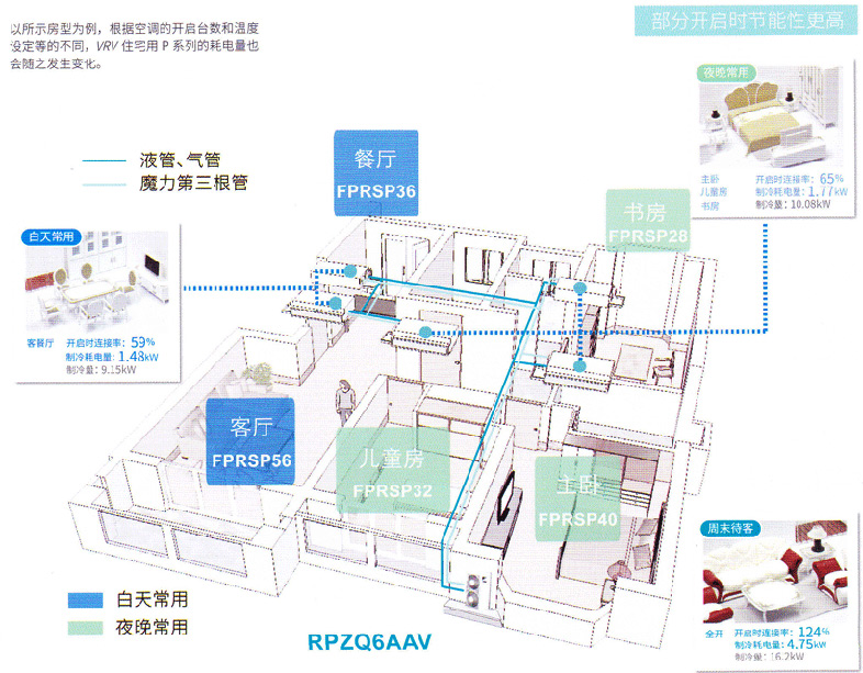 以三户两厅(160平米)选用VRV住宅用P系列(RPZQ6AAV)为例,根据空调的开启台数和温度设定等不同,VRV住宅用P系列的耗电量也会随之发生变化,部分开启时节能性会更高。