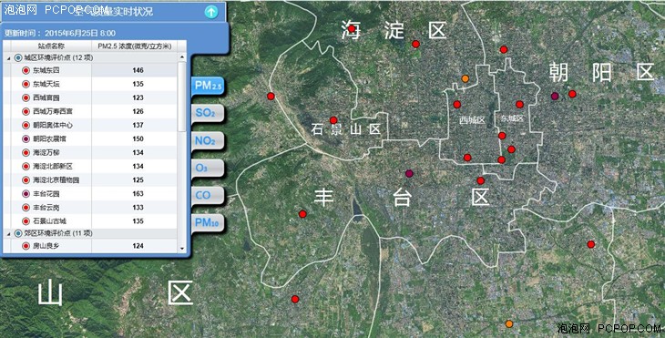下图是我在上周四截取的北京市环保监测中心发布的空气质量数据,能够明显看到的是红色状态已经覆盖了几乎北京的市区。空气质量中红色代表中度污染,PM2.5浓度区间是116-150ug/m3,这个数据放在冬天也并不算低。